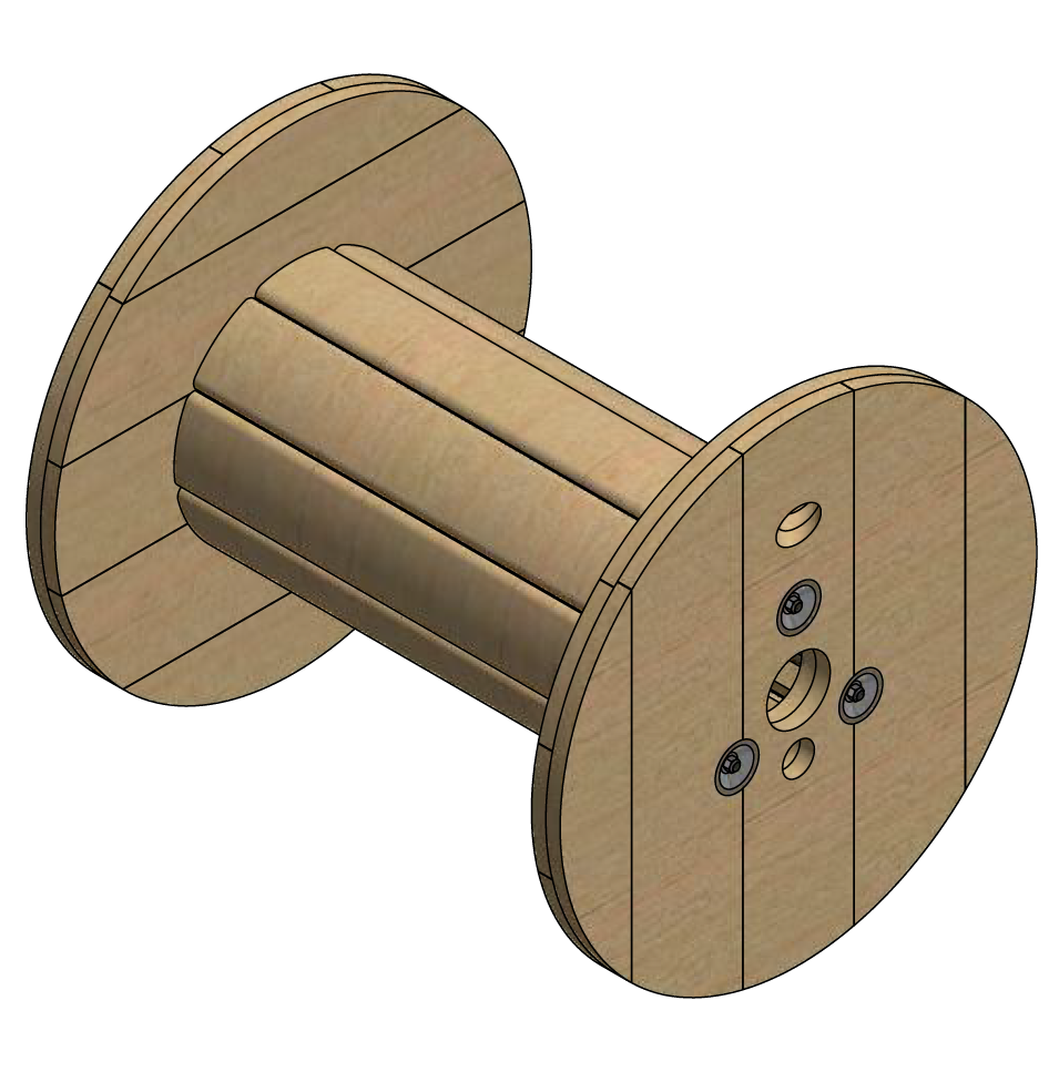 El carretel consta de dos tapas circulares reforzadas (alas), unidas por un cilindro de madera (tambor), el cilindro está conformado por maderas semi curvadas llamadas duelas, los tres componentes se encuentran unidos para esfuerzo por compresión con arandelas, tuercas y tensores de acero.